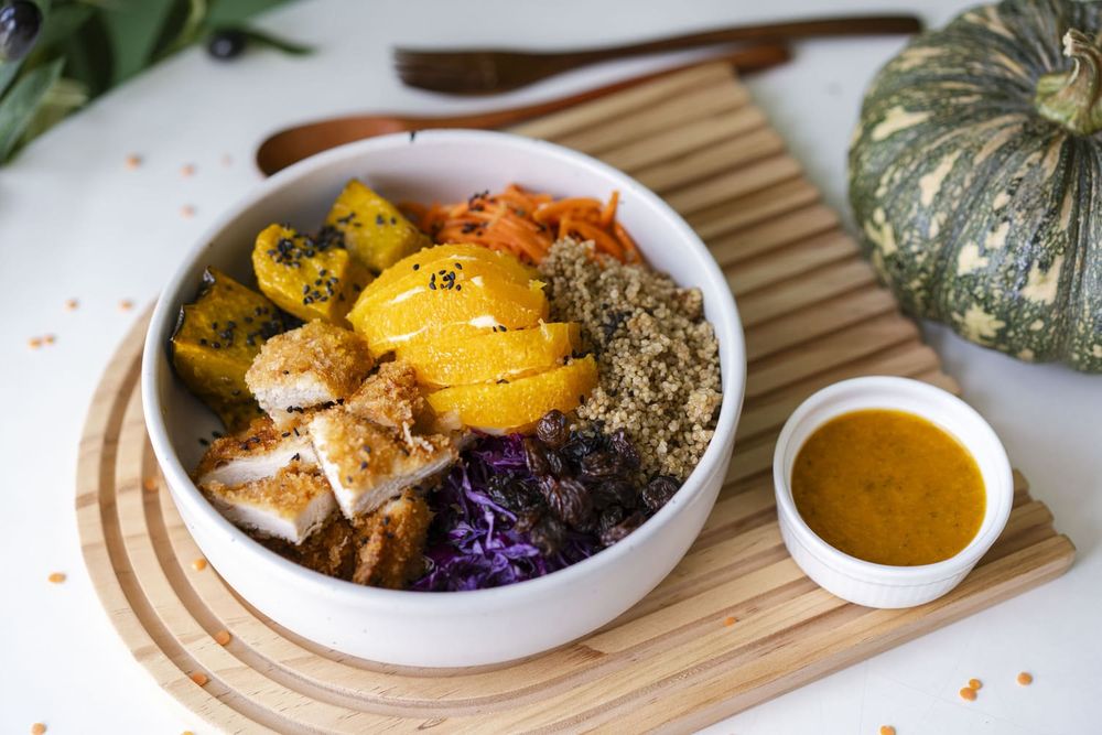 🍗 Quinoa, fried chicken, pumpkin, Korean-style carrot, orange, purple cabbage, raisins & mango sauce. | 533 kcal P: 21g F: 21g C: 68g