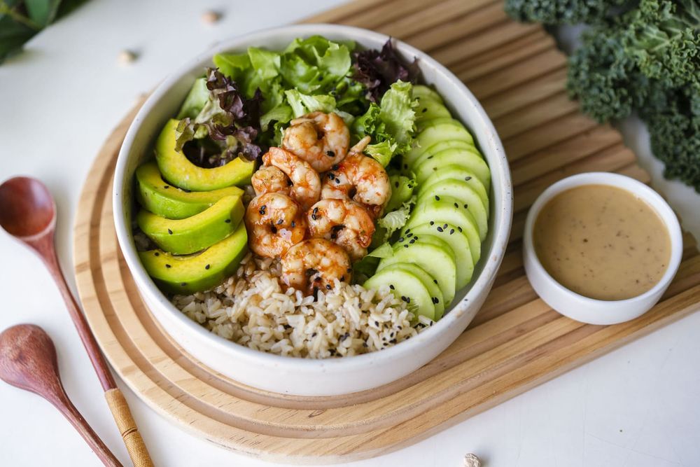 🍤 Double shrimp, brown rice, avocado, cucumber, greens & sesame sauce. A fresh, high-protein bowl packed with flavor | 475 kcal P: 14g F: 21g C: 59g