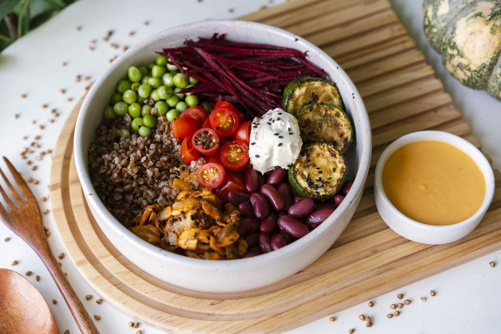 🥗 Buckwheat, mushrooms, beans, beetroot, cherry tomatoes, avocado, walnuts & cashew sauce – plant power in every bite 433 kcal P: 20g F: 12g C: 61g